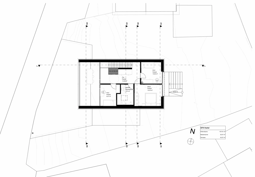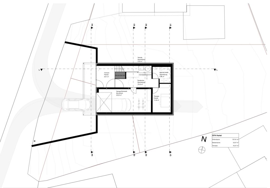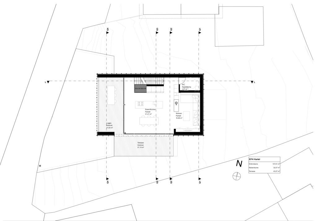 der baugrund selbst ist ein steiler südhang in einer abgelegenen ferienhaussiedlung mit einer mischung aus bedarfsbauten, einfachen hütten und ausgebauten ferienhäusern.