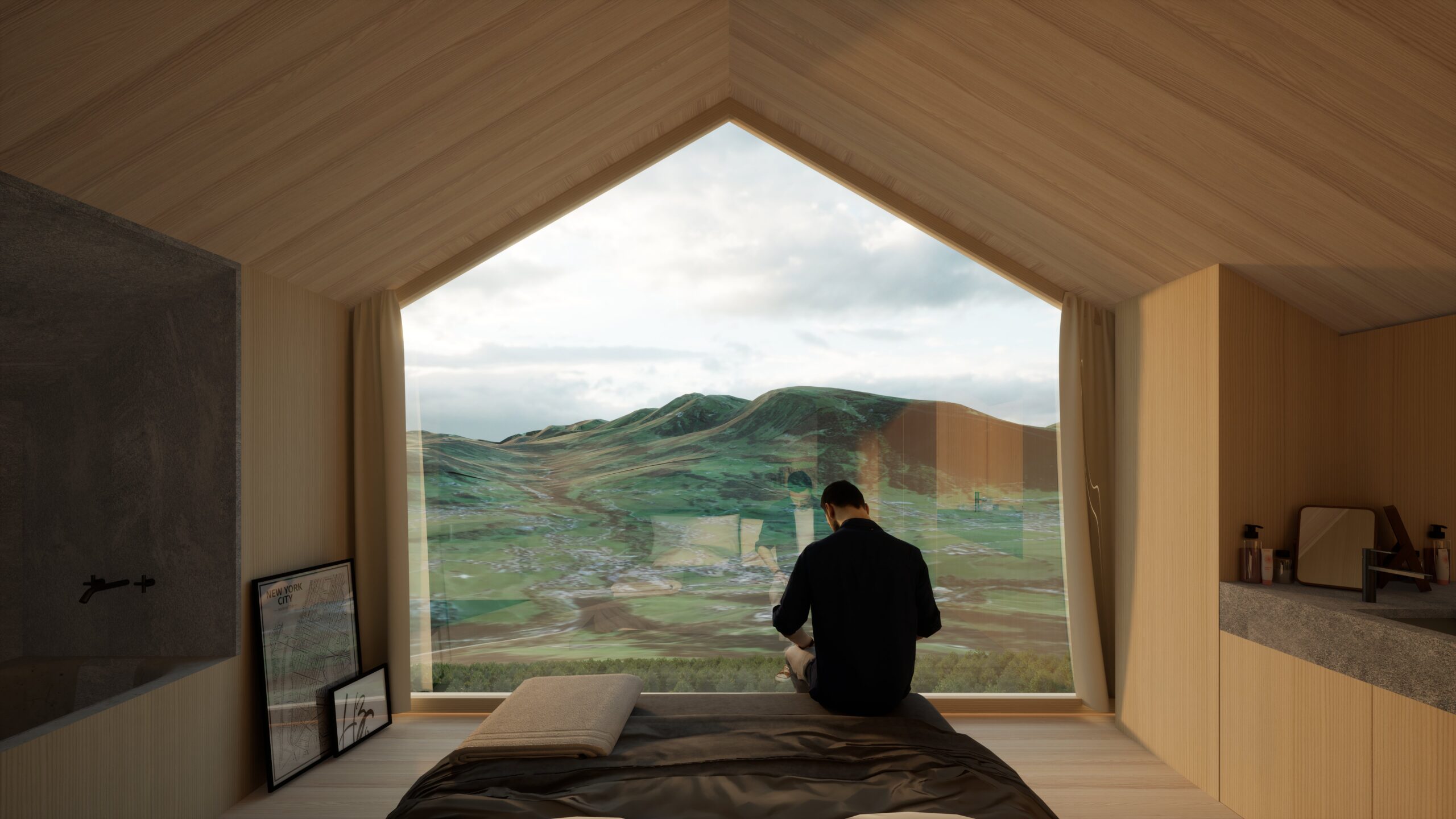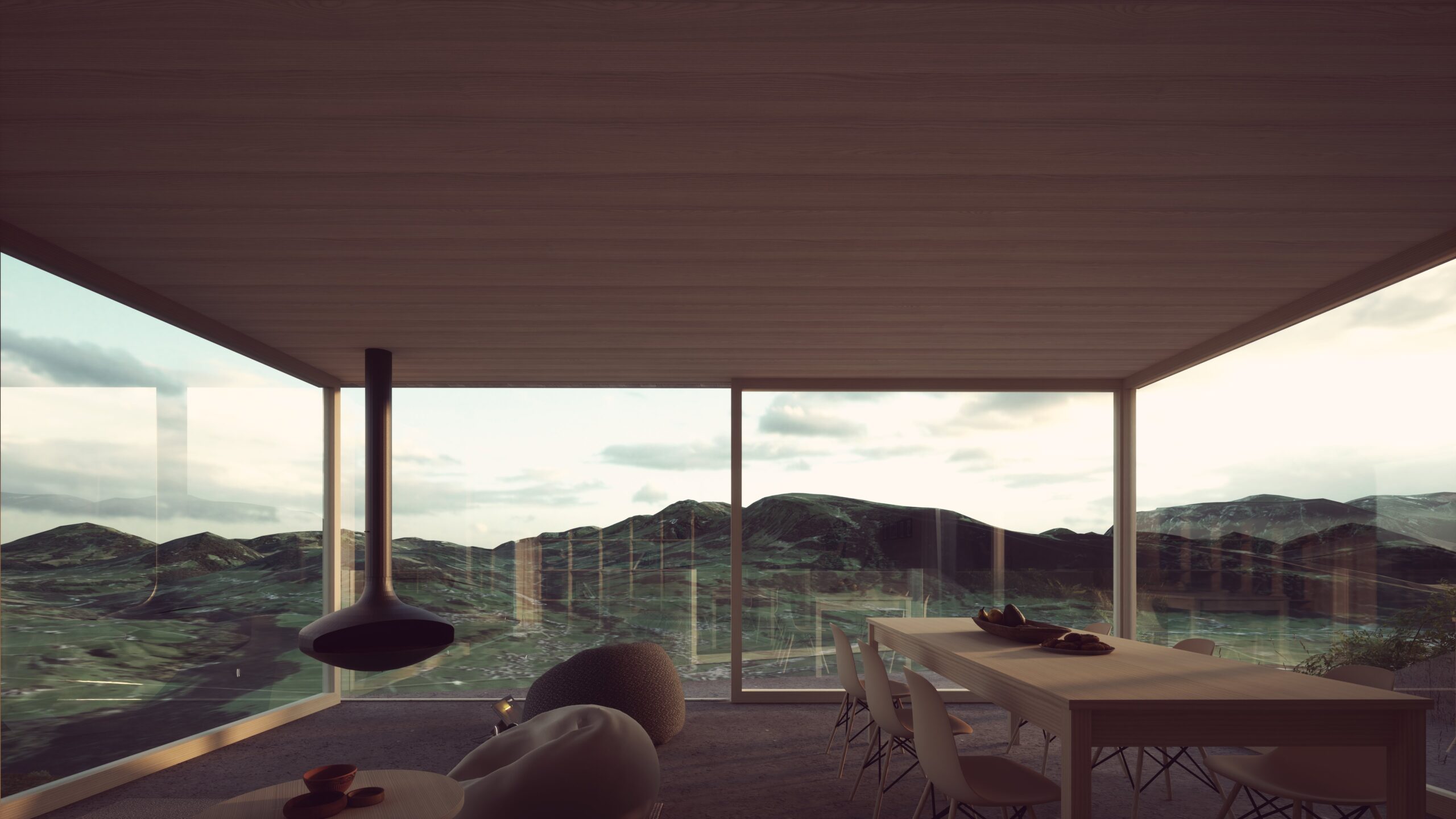 der innenbereich ist zu großen teilen in heimischer weißtanne bekleidet. vom schlafzimmer aus sind große teile des tals und viele der prominenten bergspitzen sichtbar.
